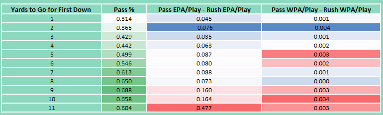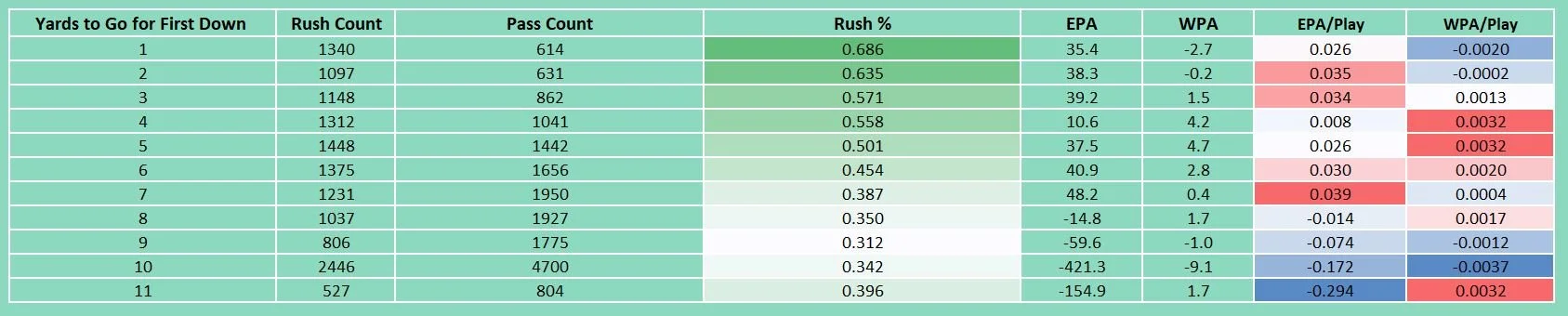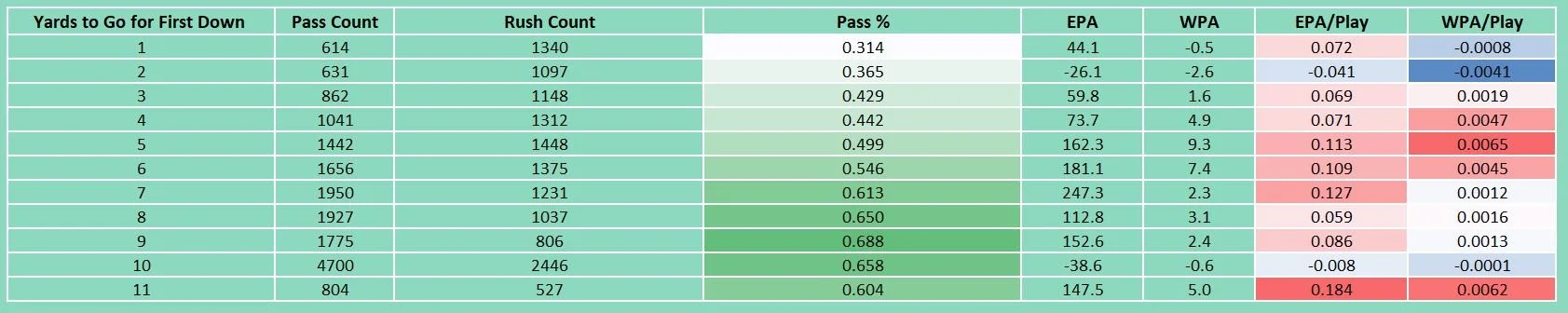 As shown in Table 1, the percentage of pass plays increases as the distance to gain a first down grows. Pass plays have demonstrated particularly strong EPA (Expected Points Added) per play in the 5–7 yards to go range, as well as at 11 yards to go. Similarly, their WPA (Win Probability Added) per play is high in the 4–6 yards to go range and again with 11 yards to go. However, pass plays have performed poorly in both EPA and WPA when facing just 2 yards to go.