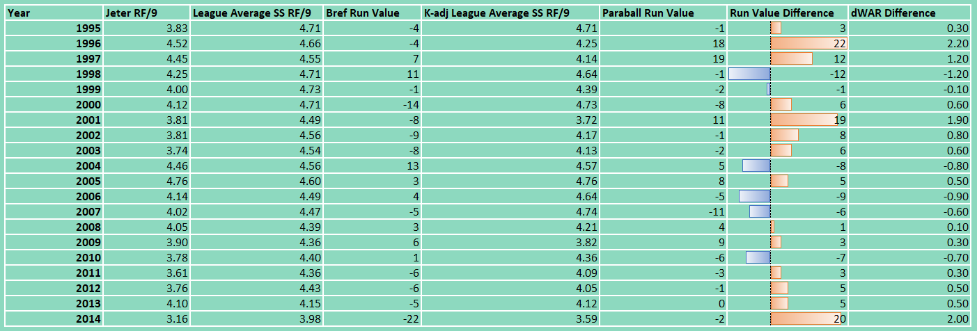 Table 1: Jeter’s RF/9, League Average SS RF/9, Baseball Reference Defensive Run Value, K-adj League Average SS RF/9, Paraball Defensive Run Value, Defensive Run Value Difference, and dWAR Difference