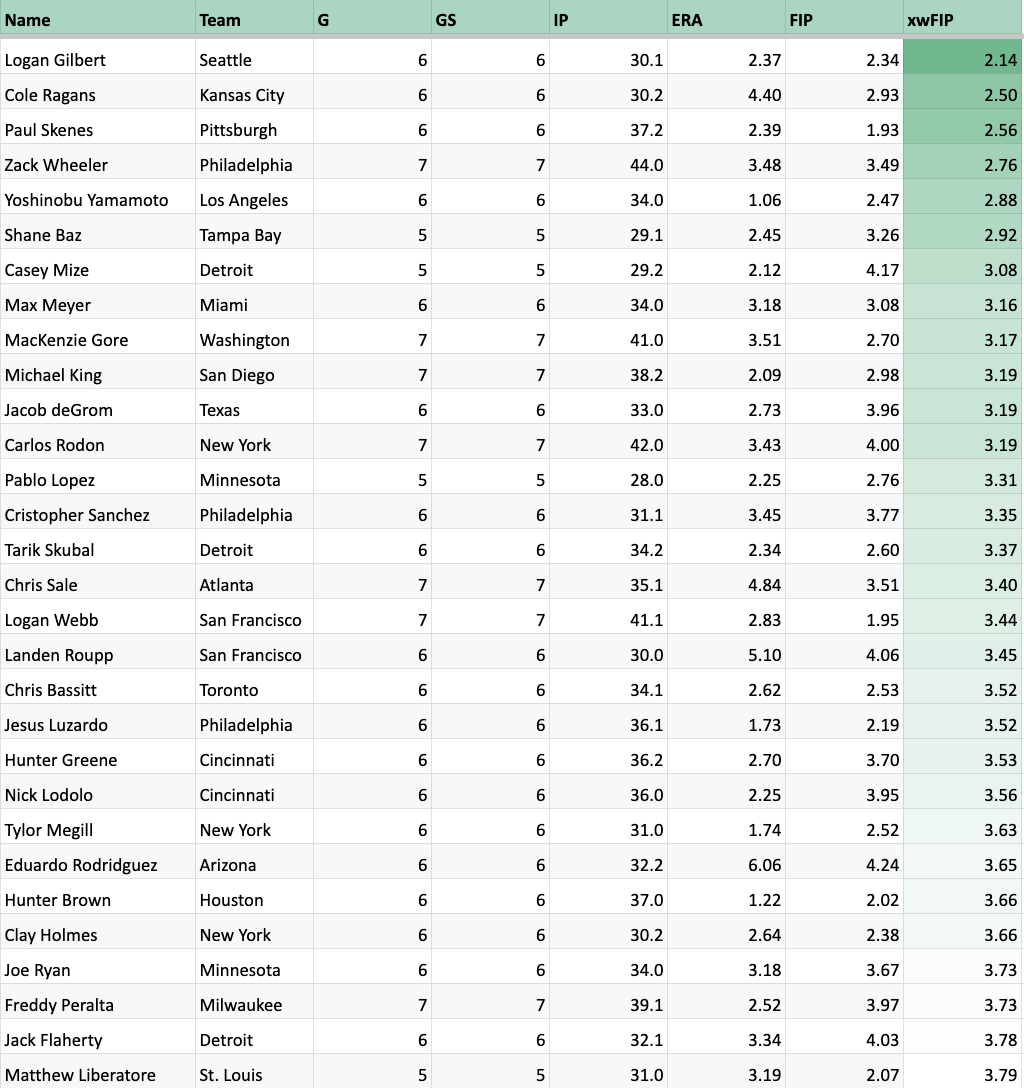 Table 2: Top 30 starters by xwFIP through 4/30/25 with at least 4 starts