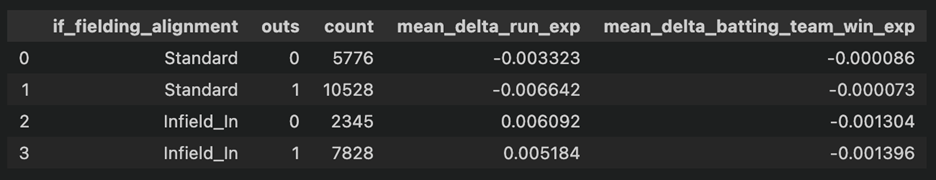 From Table 1, teams bring the infield in 29% of the time with zero outs and 43% of the time with one out. Playing the infield back is effective at reducing expected runs, as mean_delta_run_exp is lower in those cases. However, in both situations, mean_delta_batting_team_win_exp is lower when the infield is brought in. This highlights the familiar trade-off between run expectancy and win probability—and suggests that MLB teams are not making the win-maximizing decision. In most situations with runners on second and third and fewer than two outs, teams should instead bring the infield in to maximize the probability of allowing zero additional runs in the inning and, in turn, maximize overall win probability.