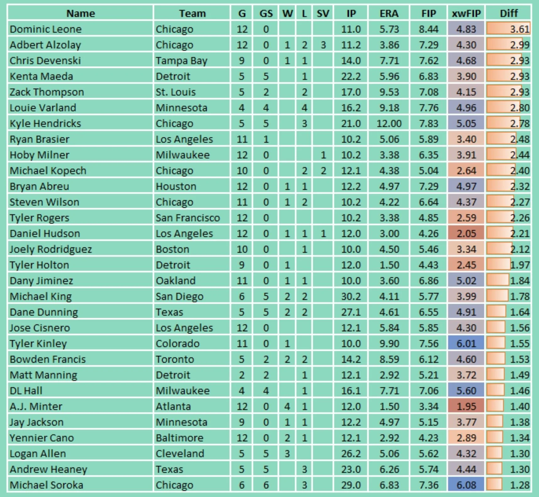 Table 2 lists the 30 starters with the best xwFIPs through April 27th, with a minimum of 20 innings pitched so far this season.