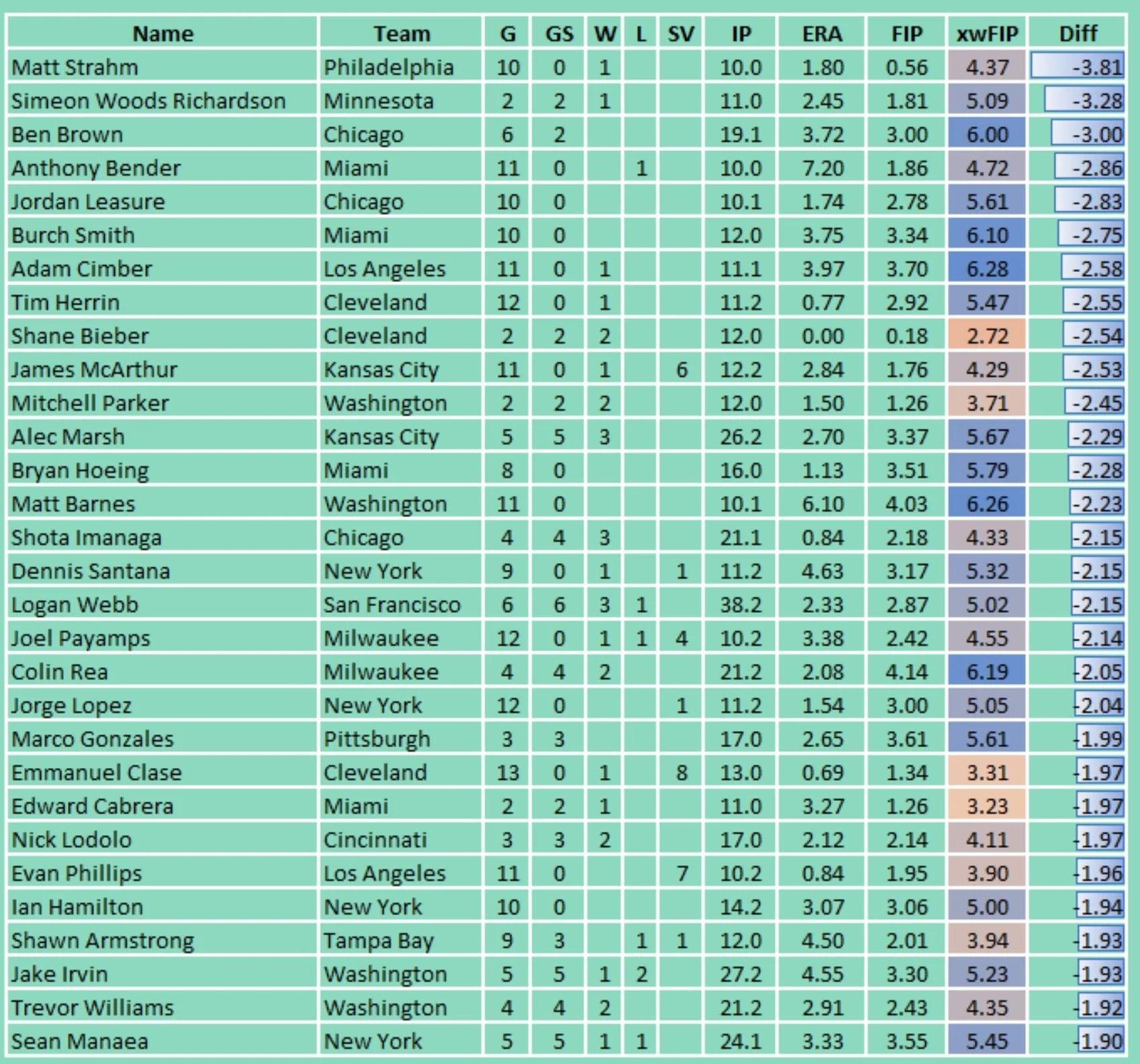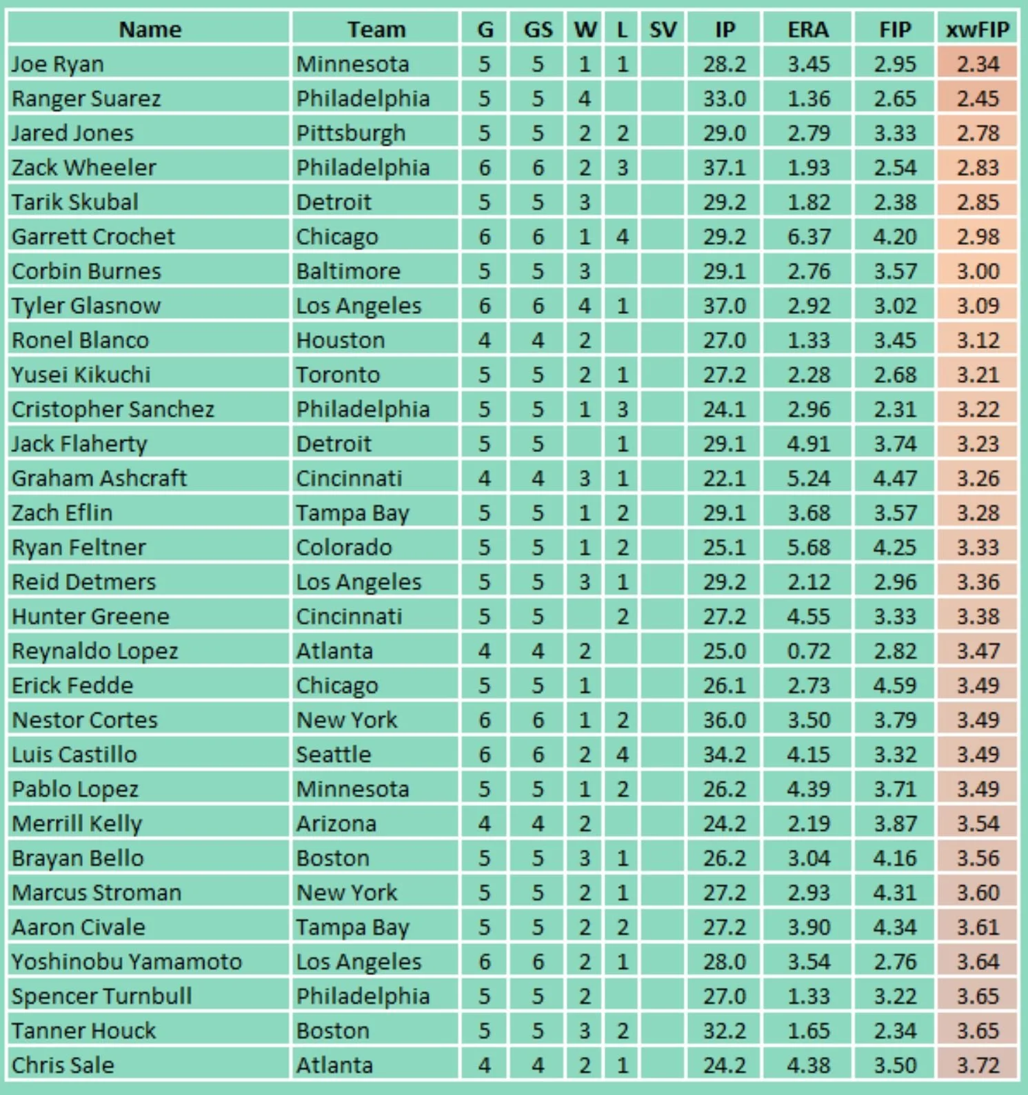 Table 2: The 30 starting pitchers with the lowest xwFIP through April 27th (min. 20 IP).
