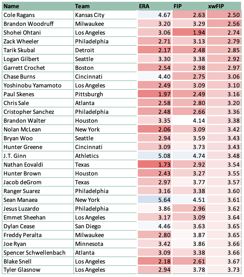 Table 2: Top 30 starters in 2025 by xwFIP (min. 40 innings pitched and 8 games started)